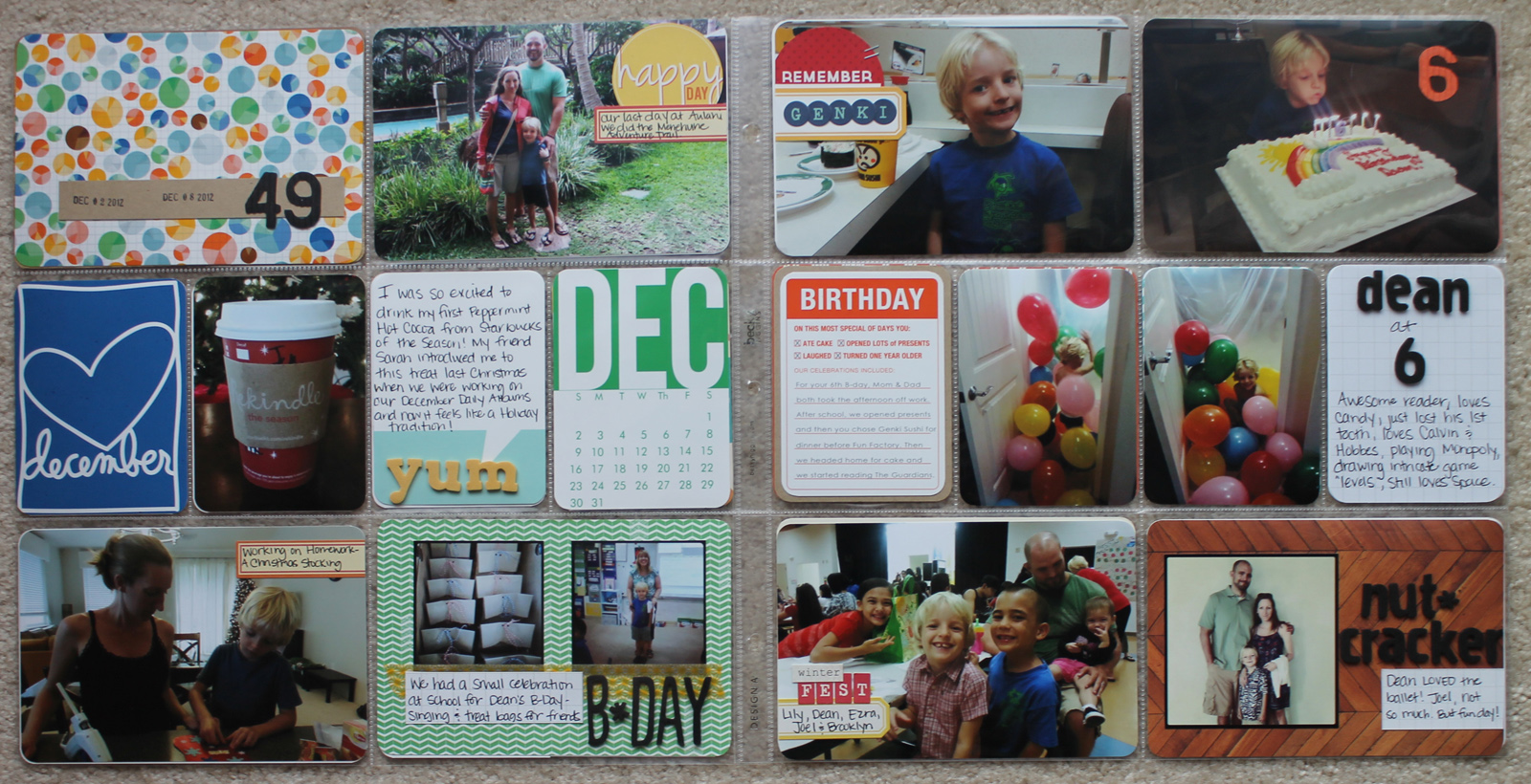 And on the right side, more birthday fun - we didn't have a real party for Dean. The last few years we've given him the choice between a party with a bunch of friends or a weekend staycation at a fancy resort and he chose the resort (bonus for him that we, along with Tutu, decided to splurge and go to Oahu this year). It probably ends up being only slightly more expensive than a party once things are all said and done, but this way there's no stress of planning a party in between Thanksgiving and Christmas - and Joel & I actually get to relax and enjoy ourselves too! So on his actual birthday (Dec 6th), he wanted to go to dinner at Genki Sushi, then we just had cake at home with the 3 of us. There are also photos from his school's Winterfest event (SO FUN!) and our trip to see our local Maui Academy of Performing Art's production of the Nutcracker.